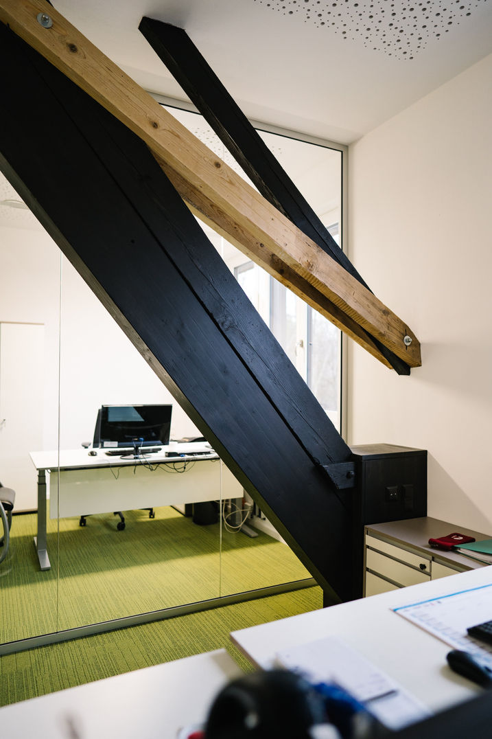 Das Bürogebäude eines großen Industriebetriebes in Kärnten sollte auch im Dachgeschoss genutzt werden. Neue Räumlichkeiten innerhalb des sehr gut erhaltenen Dachstuhls bringen eine komplette Umstrukturierung des Gebäudes mit sich. Durch den Einbau eines Aufzugs werden alle Geschosse barrierefrei erreichbar. Ein neuer Empfangsbereich im Erdgeschoss spricht die Besucher bereits beim Betreten des Gebäudes an und leitet diese an den richtigen Ort. Das Aufmachen des Dachs mit einer durchgängigen Dachgaube wirkt unauffällig, bringt aber enorm viel Licht ins Gebäude.